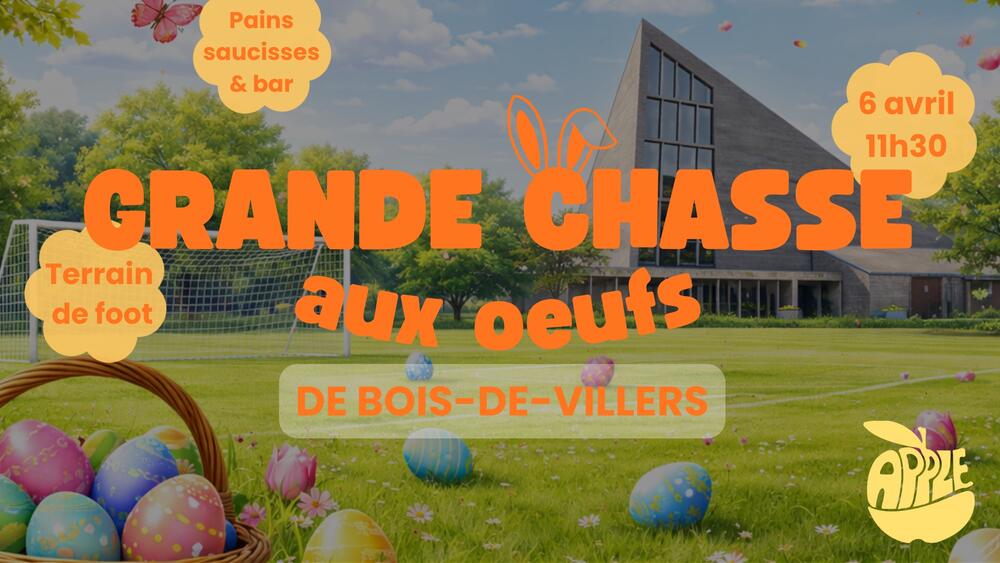 Le comité d’animation APPLE vous invite à sa traditionnelle chasse aux œufs pour les enfants jusqu’à 12 ans, organisée au terrain de football de la J.S. Bois-de-Villers.
