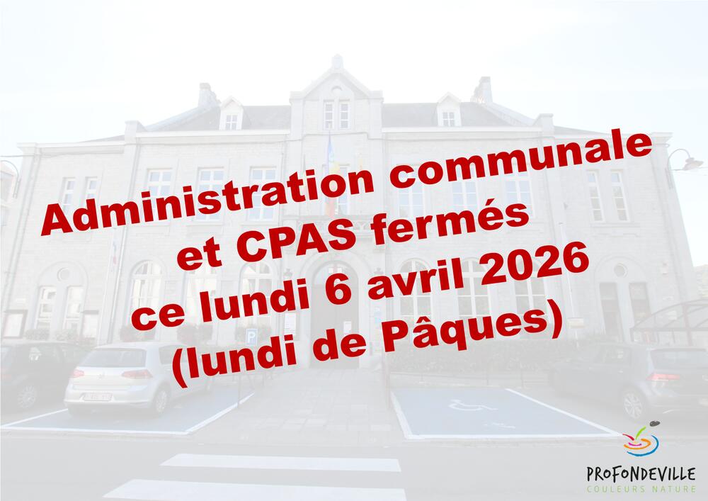 Les bureaux de l'Administration communale et du CPAS de Profondeville seront fermés en raison de la fête de Pâques le lundi 06 avril 2026.