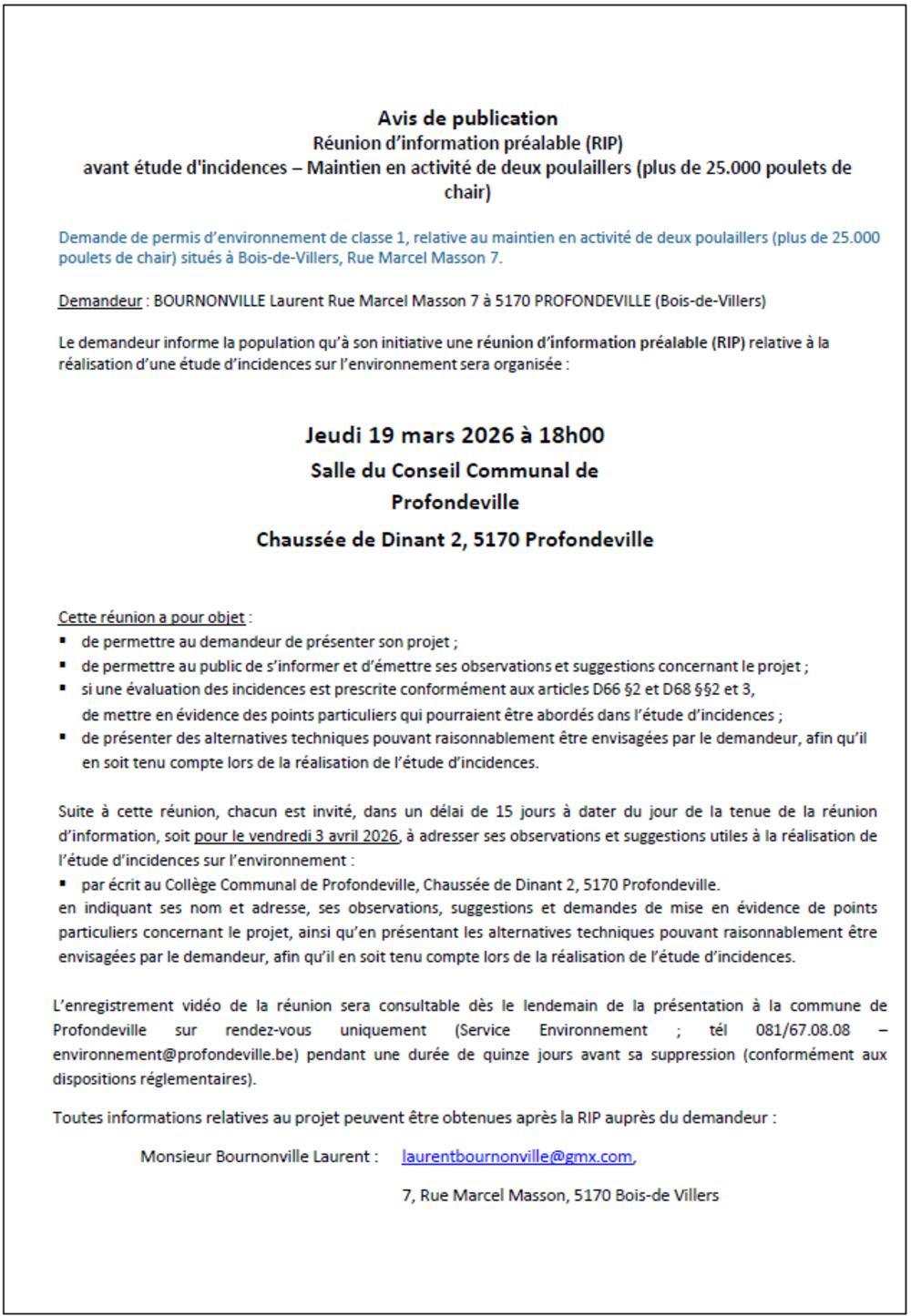 Une réunion d’information préalable (RIP) sera organisée concernant une demande de permis d’environnement (classe 1) pour le maintien en activité de deux poulaillers (plus de 25.000 poulets de chair) situés Rue Marcel Masson 7 à Bois-de-Villers.